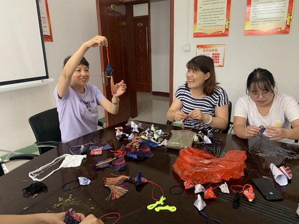 在傳統(tǒng)習俗中,玲瓏可愛的各色香包也是端午節(jié)必不可少的元素。包完粽子后大家轉(zhuǎn)移陣地到了活動室,大家圍坐桌邊,面前堆放著一份份材料包,有棉布、艾草、針線、中國結流蘇。面對這個從來沒有做過的DIY,大家開始研究起來,有的用手機搜索縫制方法流程,有的直接比來比去親自摸索著縫起來。有職工說:“這有點像咱們小時候老人們縫的毽子,那個里面裝的是五谷雜糧,咱們現(xiàn)在裝的是艾草?!薄斑@香囊可以掛在辦公室或者車上,有清香、驅(qū)蚊的功效?!薄拔宜闶侵懒?,這個流蘇應該縫在這個邊的中間,而不是角上……”大家你一句我一句,手中的針線穿梭在棉布間,用密密的針腳縫制出傳統(tǒng)佳節(jié)最好的注解,用絲絲線線纏繞出端午安康的美滿寓意,一個個精巧可愛的三角香囊在大家的努力下完美呈現(xiàn)。