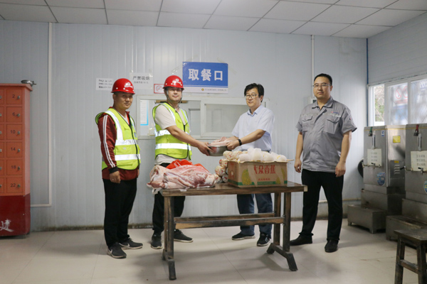 之后,劉志剛帶著月餅、豬肉等慰問品到作業(yè)班組生活區(qū)對(duì)一線工人進(jìn)行慰問,在食堂劉志剛把豬肉遞到班組長手里并囑咐他們一定要提高節(jié)日期間的伙食水平,讓堅(jiān)持在現(xiàn)場(chǎng)施工的工人吃好,消除他們的后顧之憂。