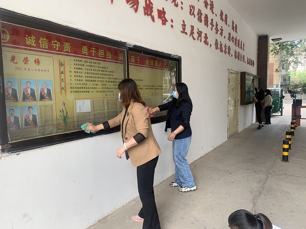 院內(nèi)整理清掃完畢后,大家又轉(zhuǎn)移陣地到辦公樓內(nèi),對辦公室、廁所、樓道等區(qū)域進(jìn)行了打掃。黨員們充分發(fā)揚(yáng)“甩開膀子、挑起擔(dān)子”的精神,擦拭玻璃、打掃地面、清理垃圾,全方位消毒噴殺,每一步都認(rèn)真到位,不留死角。經(jīng)過近三個(gè)小時(shí)的辛勤勞動(dòng),院里綠化帶的枯枝、雜草得到了整治,機(jī)關(guān)大院內(nèi)更加整潔美觀,環(huán)境煥然一新。機(jī)關(guān)辦公室窗明幾凈、一塵不染,所有衛(wèi)生死角被徹底清理。大家擦擦汗水,露出會(huì)心的微笑。