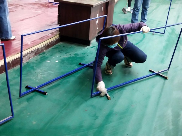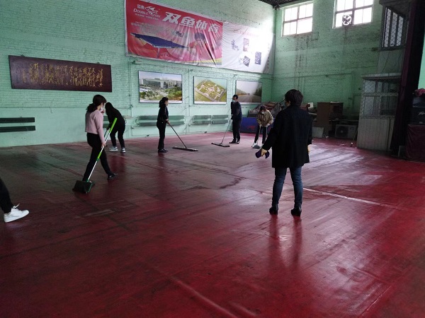 參與活動的20余名同志,分工合作,雖然大家來自不同部門、不同崗位,但爭先恐后、合作默契,清理地面、擦拭健身器材、清潔桌凳?!扒懊娴哪型緜兗佑土耍覀兛熠s上你們了!”負責拖地的九分公司主任經(jīng)濟師劉彩在后面說道?!斑@個乒乓球擋布拿抹布擦拭的效果不太好,用外面的高壓水槍沖洗試試吧!”九分公司主任會計師付世芳一邊用抹布擦拭擋布一邊提出自己的合理化建議,“這個辦法好!”九分公司綜合辦公室主任張路平同意道。