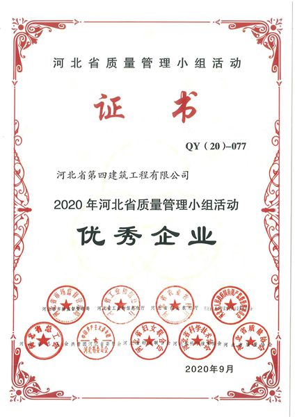11月10日,公司收到中國建筑業(yè)協(xié)會(huì)《關(guān)于2020年工程建設(shè)質(zhì)量管理小組活動(dòng)成果大賽的通知》和河北省質(zhì)量協(xié)會(huì)《關(guān)于印發(fā)2020年河北省質(zhì)量管理小組活動(dòng)質(zhì)量科技成果及優(yōu)秀企業(yè)、卓越領(lǐng)導(dǎo)者、優(yōu)秀推進(jìn)者名單的通知》兩份文件。文件公布了各項(xiàng)榮譽(yù)的獲獎(jiǎng)名單,公司獲得2020年河北省質(zhì)量管理小組活動(dòng)優(yōu)秀企業(yè)。公司推薦的11個(gè)成果以及5個(gè)優(yōu)秀個(gè)人分別獲獎(jiǎng),3項(xiàng)成果獲得全國獎(jiǎng)項(xiàng)。