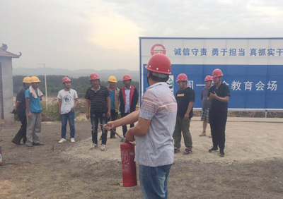 項(xiàng)目部即將進(jìn)行墊層混凝土澆筑施工,現(xiàn)場(chǎng)有大量的木模板、油漆等易燃品,正值高溫季節(jié),火災(zāi)隱患較大。項(xiàng)目部結(jié)合現(xiàn)場(chǎng)實(shí)際組織了本次消防演練,演練分為消防知識(shí)培訓(xùn)和火災(zāi)事故演練兩部分。演練前項(xiàng)目經(jīng)理李宏偉通報(bào)了溫嶺槽罐車(chē)爆炸事故造成的嚴(yán)重后果,闡明本次演練的目的和意義。隨后項(xiàng)目部安全員王東春對(duì)滅火常識(shí)、火災(zāi)逃生方法、滅火器如何使用等進(jìn)行了講解,并演示了手提式干粉滅火器的具體使用方法,參與演練的人員親自體驗(yàn)了滅火器的使用。