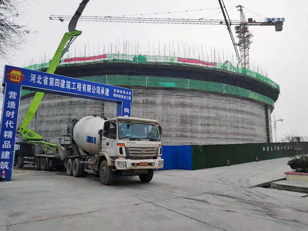 熟料儲存及輸送筒倉直徑60米,高20.5米。1月11日,業(yè)主項目負責(zé)人王利杰組織召開專題會議,鄭重要求1月20日前滑模施工必須完成。面對業(yè)主早日投產(chǎn)的殷切期盼,項目部緊急組織施工策劃,明確搶進度措施辦法,全體動員,多點發(fā)力,全力以赴?;J┕?。在動員會上,成立了以項目經(jīng)理為組長的滑模領(lǐng)導(dǎo)小組,班子帶班,明確責(zé)任目標(biāo);與作業(yè)班組簽訂安全、質(zhì)量承諾書,增強其責(zé)任意識;購置鋼筋間距測量設(shè)備,節(jié)省驗收鋼筋工程時間和人力。由于疫情原因,現(xiàn)場勞力不能迅速到位,項目部提前組織管理人員晚上加班吊運鋼筋、水泥、腳手板等材料,大家高漲的干勁兒在滑模現(xiàn)場起到了積極的帶動作用。庫壁預(yù)應(yīng)力鋼絞線設(shè)置較為密集,每間隔26厘米一道,而且?guī)в腥嵝?,往庫壁鋼筋?nèi)穿設(shè)時容易跑偏,工作效率低。為加快施工,技術(shù)人員巧妙地在庫壁鋼筋上加設(shè)了U型鋼筋固定鋼絞線穿行位置,然后大家一字排開,“一二、一二……”齊聲喊著口號,有節(jié)奏地用力將鋼絞線在庫壁鋼筋里穿行直到扶壁柱。數(shù)九隆冬的夜間滑模平臺上氣溫很低,但是大家的工作熱情不減,干勁不退,抬鋼筋、綁鋼筋、穿鋼絞線……,干得熱火朝天,沒有人叫苦喊累,在大家的共同努力下,滑模以每天2.7米的速度快速推進。