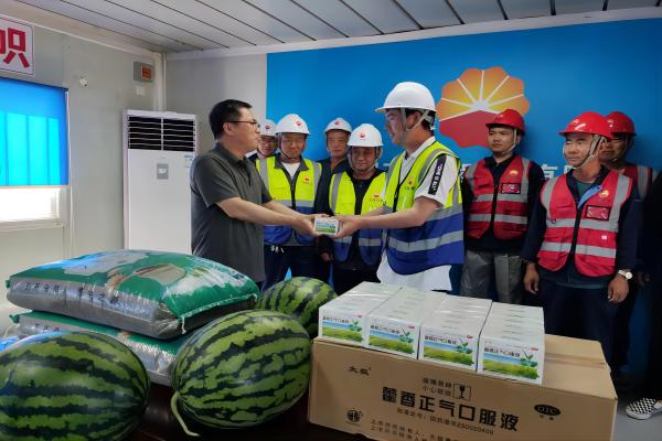 因近日持續(xù)高溫,現(xiàn)場的施工環(huán)境給堅(jiān)守一線的施工人員帶來了嚴(yán)峻“烤”驗(yàn),也時(shí)刻牽動著分公司領(lǐng)導(dǎo)的心。6月12日,分公司黨支部書記、工會主席臧聯(lián)合到項(xiàng)目部詳細(xì)了解一線人員工作和生活情況,檢查消防和防暑降溫工作,為大家發(fā)放了西瓜、綠豆、藿香正氣口服液等防暑物品,為高溫下堅(jiān)守崗位的項(xiàng)目職工帶來了“娘家人”的問候和關(guān)懷,并叮囑大家要在保障自身安全前提下完成好項(xiàng)目工作。