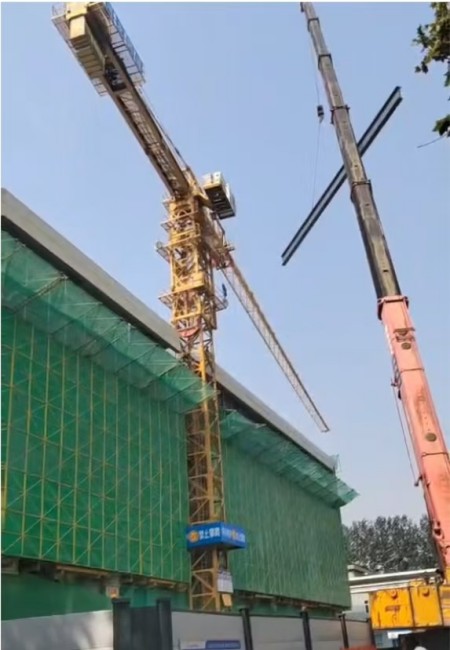 “大臂往右,慢一點……”塔吊下,信號工通過對講機指揮塔吊緩慢旋轉(zhuǎn)避讓。隨后,負(fù)重吊車精準(zhǔn)、平穩(wěn)地將鋼梁吊裝到施工區(qū)。