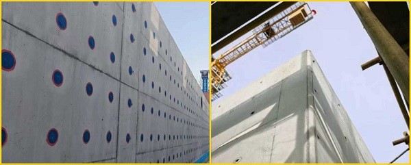 紅藍(lán)標(biāo)識(shí)打造“秩序之美”,破解外墻防水難題。地下室外墻防水是工程施工重點(diǎn),直接關(guān)系居民居住質(zhì)量。項(xiàng)目部采用三段式止水螺桿替代傳統(tǒng)通絲螺桿,中間段留置墻內(nèi)形成止水屏障,兩端錐形頭可拆除,形成規(guī)整錐形坑。項(xiàng)目部創(chuàng)新采用紅藍(lán)圓形防水涂料封堵工藝,經(jīng)螺桿眼清理、砂漿封堵、分層精準(zhǔn)涂刷等工序,以螺桿眼為圓心交替涂刷紅、藍(lán)涂料,形成整齊矩陣。原本普通的螺桿孔洞變身外墻“紐扣”陣列,既展現(xiàn)工業(yè)秩序之美,又實(shí)現(xiàn)防水質(zhì)量可視化管控,從源頭杜絕了滲漏隱患。