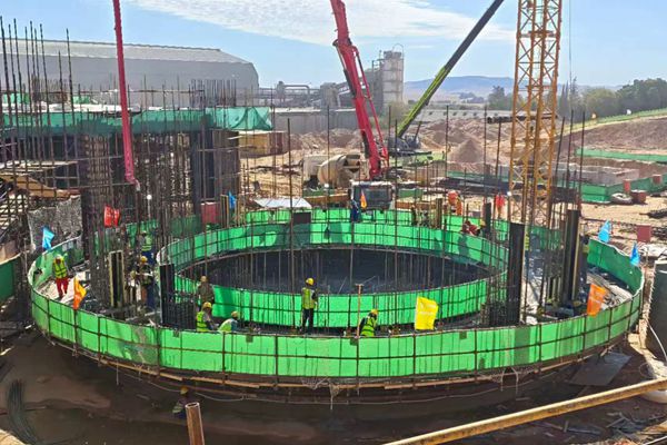 全體職工以昂揚斗志和實干作風(fēng),搶抓施工黃金期。在生料均化庫的施工現(xiàn)場,一場驚心動魄的“滑模攻堅戰(zhàn)”正成為項目建設(shè)的焦點。生料均化庫作為項目核心儲料設(shè)施,施工精度要求較高,庫體垂直度誤差需控制在毫米級,模板支護(hù)和混凝土澆筑難度遠(yuǎn)超常規(guī)工程。項目主管工程師帶領(lǐng)管理人員,白天實測數(shù)據(jù)、勘察作業(yè)面,晚上對照南非當(dāng)?shù)匾?guī)范和國際標(biāo)準(zhǔn),反復(fù)測算模板支護(hù)的受力參數(shù),優(yōu)化澆筑方案。為確保施工精度,每次澆筑前,他會組織相關(guān)人員逐一排查支架、模板的受力點分布情況,同時采用高精度定位儀實時監(jiān)測,創(chuàng)新采用“智能測控、定向分析、實時調(diào)整”工藝,嚴(yán)格控制混凝土配合比和澆筑速度,確保庫體垂直度的精準(zhǔn)。