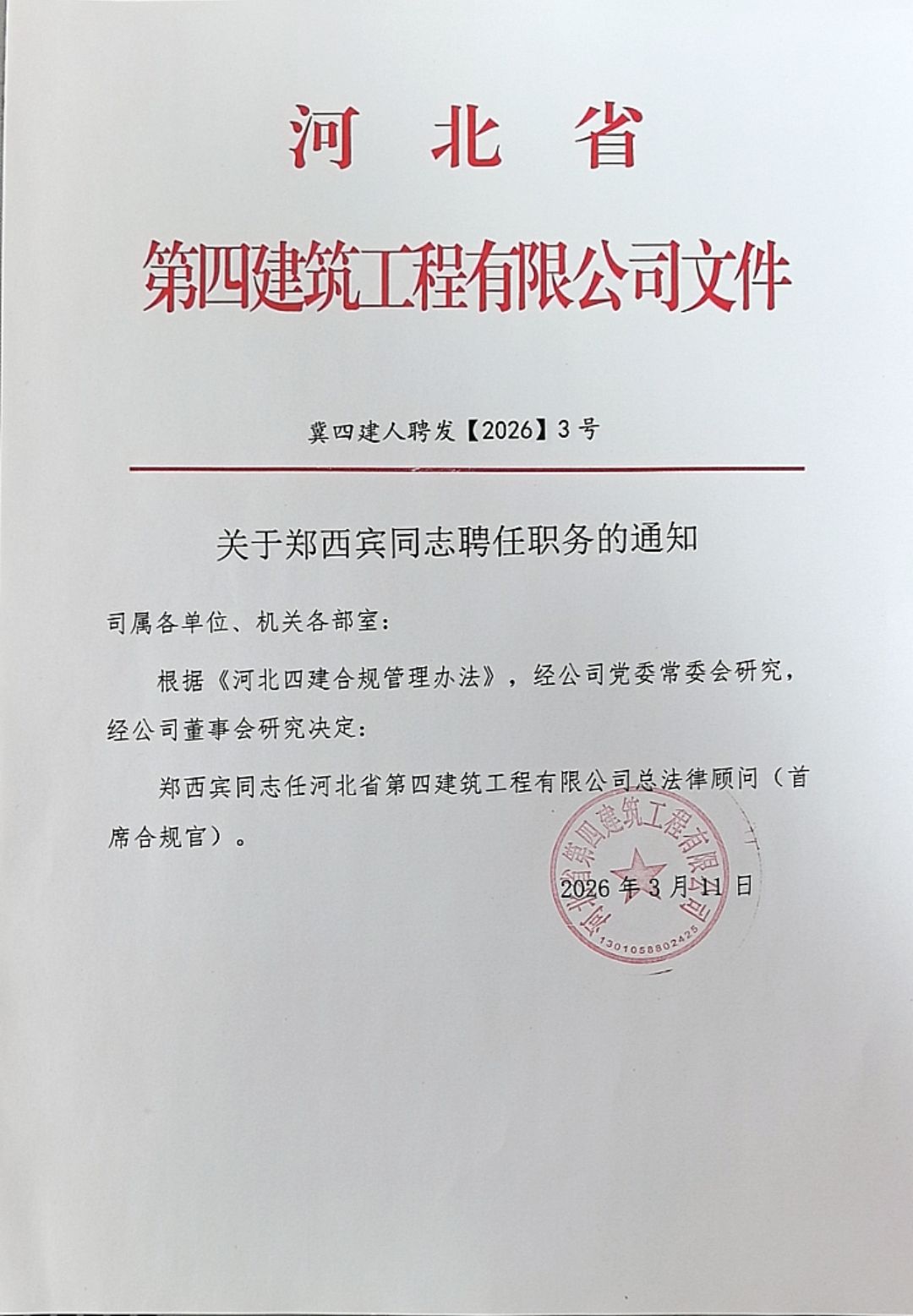關(guān)于鄭西賓同志聘任職務的通知